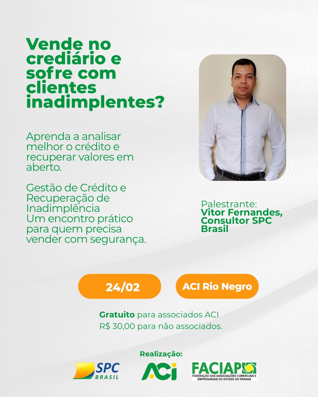 A ACI Rio Negro traz para você uma palestra exclusiva com Vitor Fernandes, consultor do SPC Brasil.